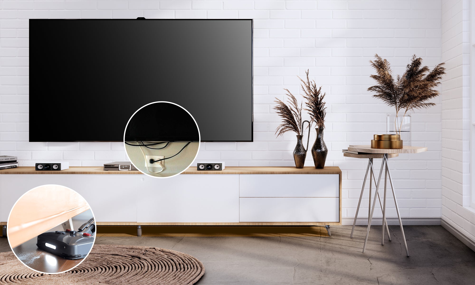 内置电缆管理系统,让电线电缆规整有序,不仅能让娱乐空间整洁美观,还能避免绊倒、线缆损坏等问题。